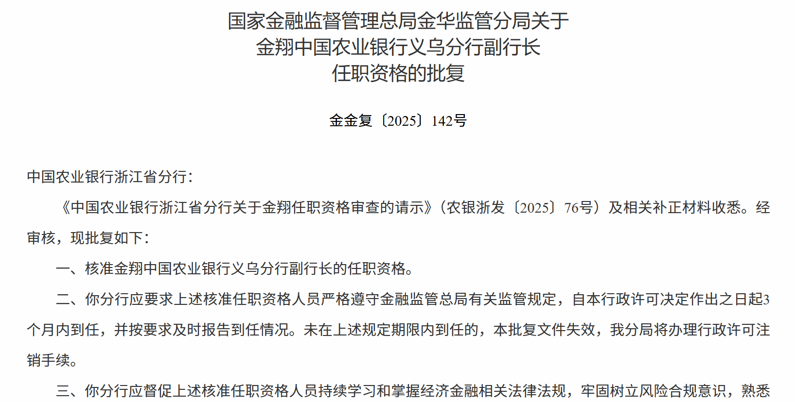 12月5日,国家金融监督管理总局金华监管分局发布关于金翔中国农业银行义乌分行副行长任职资格的批复,核准金翔中国农业银行义乌分行副行长的任职资格。